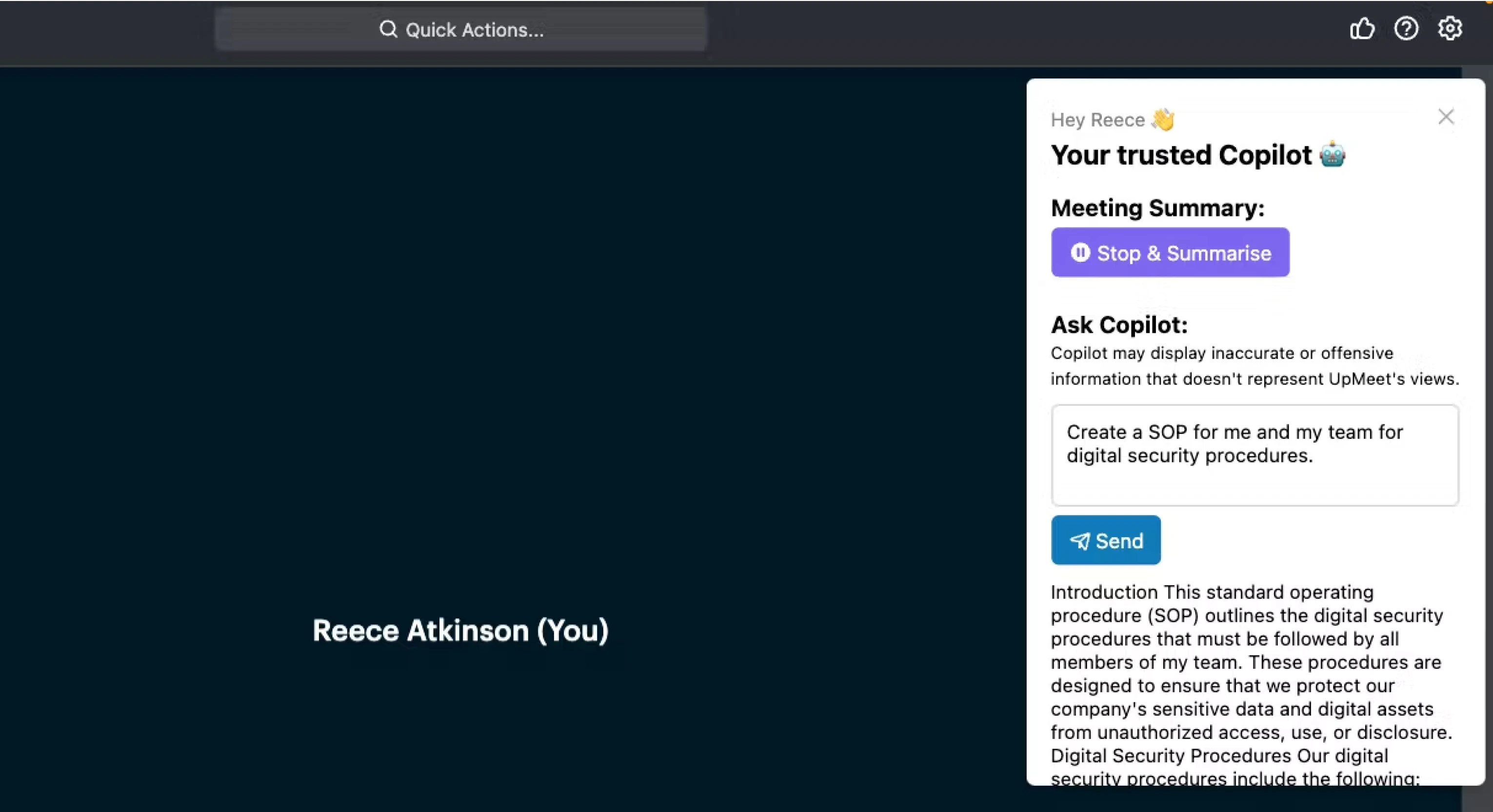 On Plus and above you can open Nova by pressing the “Nova” app in the bottom toolbar or if on mobile the “More” button and press “Ask UpMeet AI”.What stage of development is Nova in?